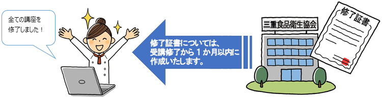 ・受講修了者には、一般社団法人三重県食品衛生協会各支部で、修了証書を交付します。なお、講習修了しても「仮の修了証書」は発行していません。